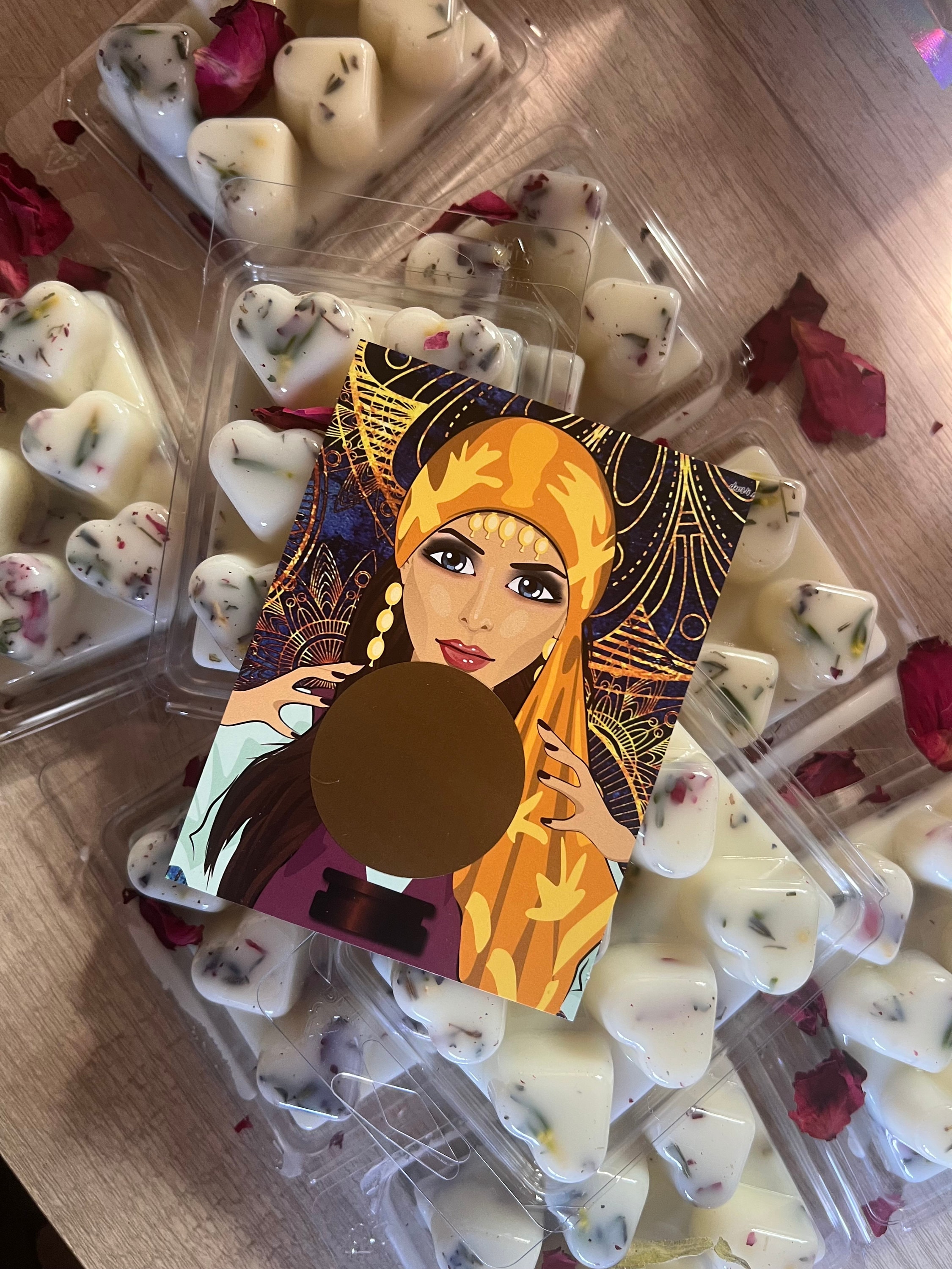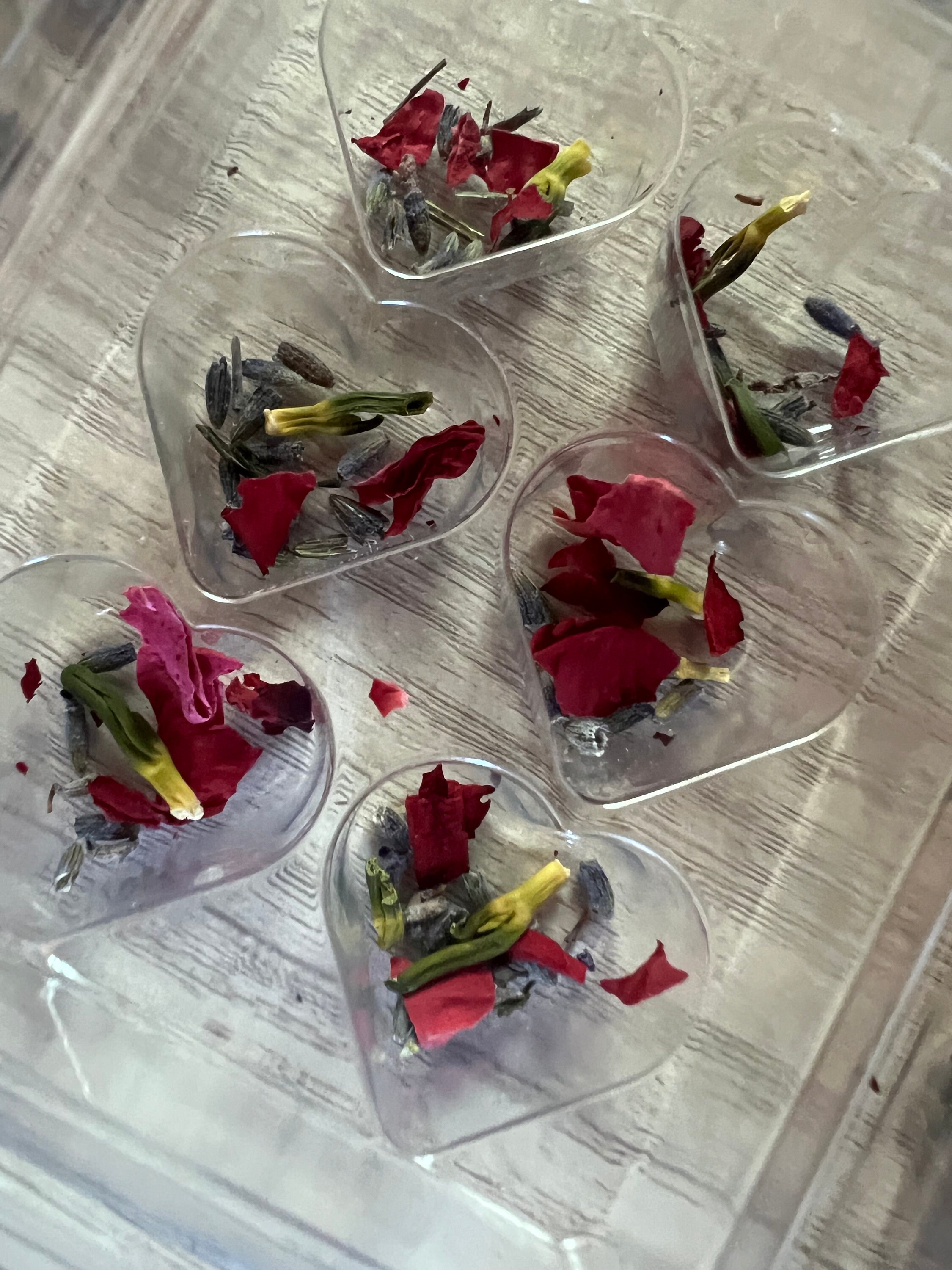 Set in heart shapes with dried lavender, rose petals and chamomile.