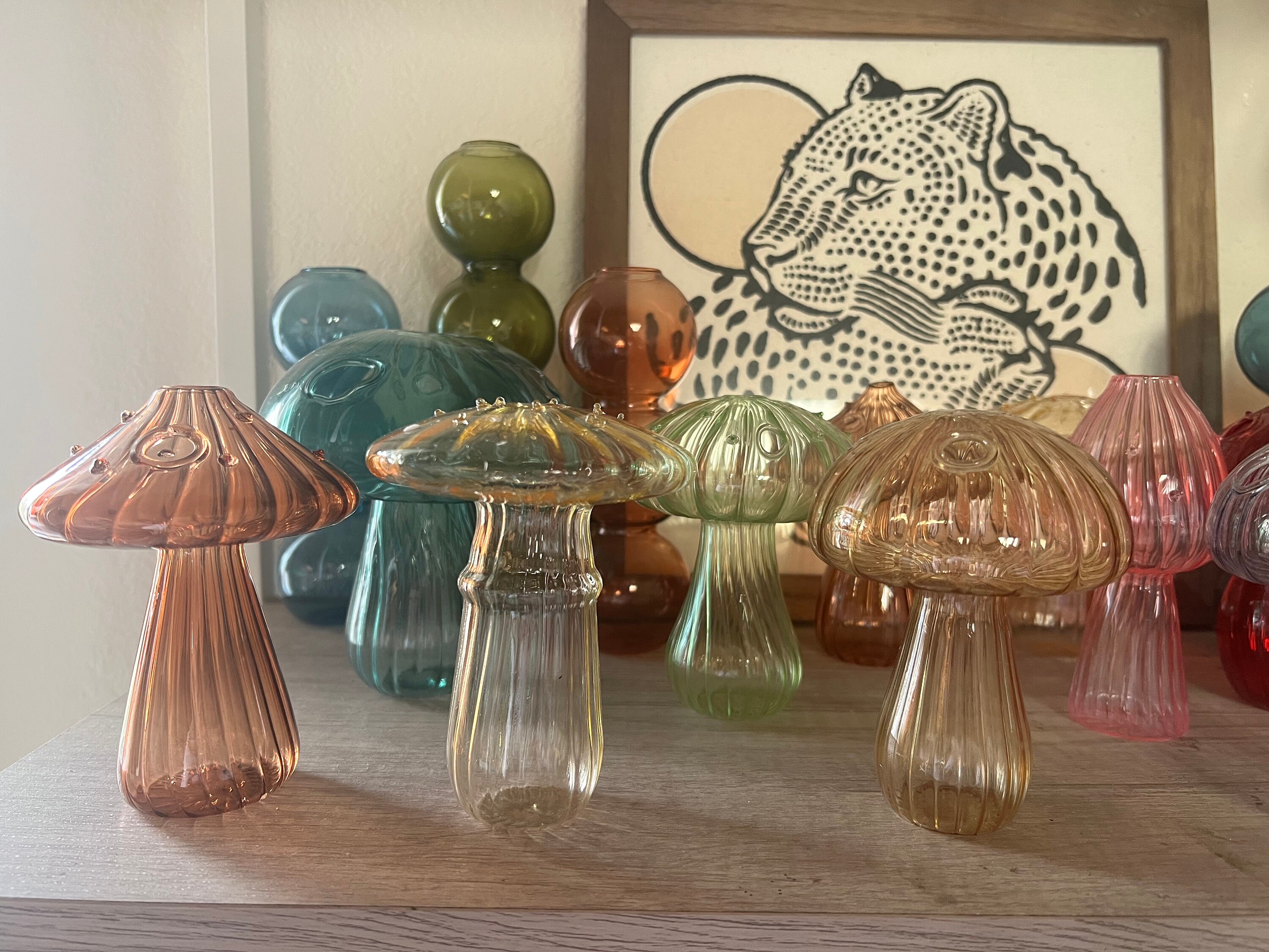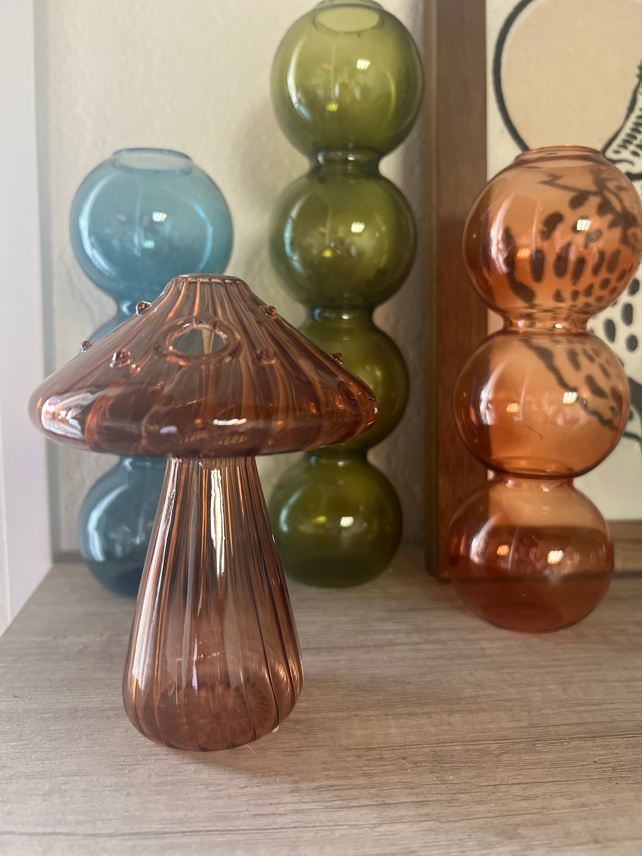 ✨✨ These tinted glass Mushroom Bud Vases will add a vibe to any room. These are great tools to help propagate plants!